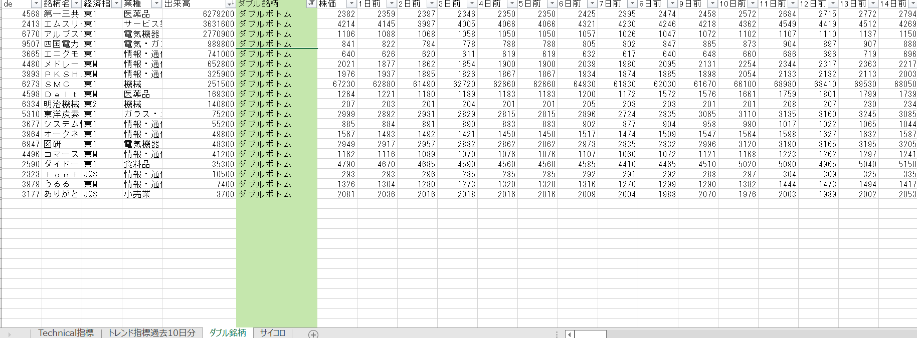 毎日毎日、ダブルボトム銘柄が選出でき、