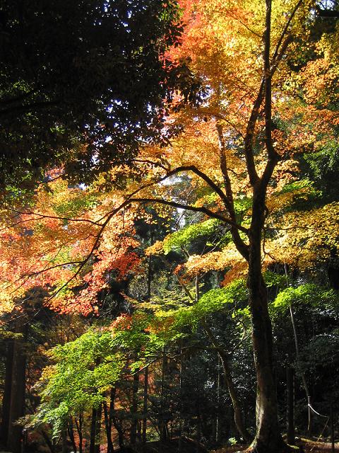 1.神護寺の石段の途中で陽が差し込んできた紅葉