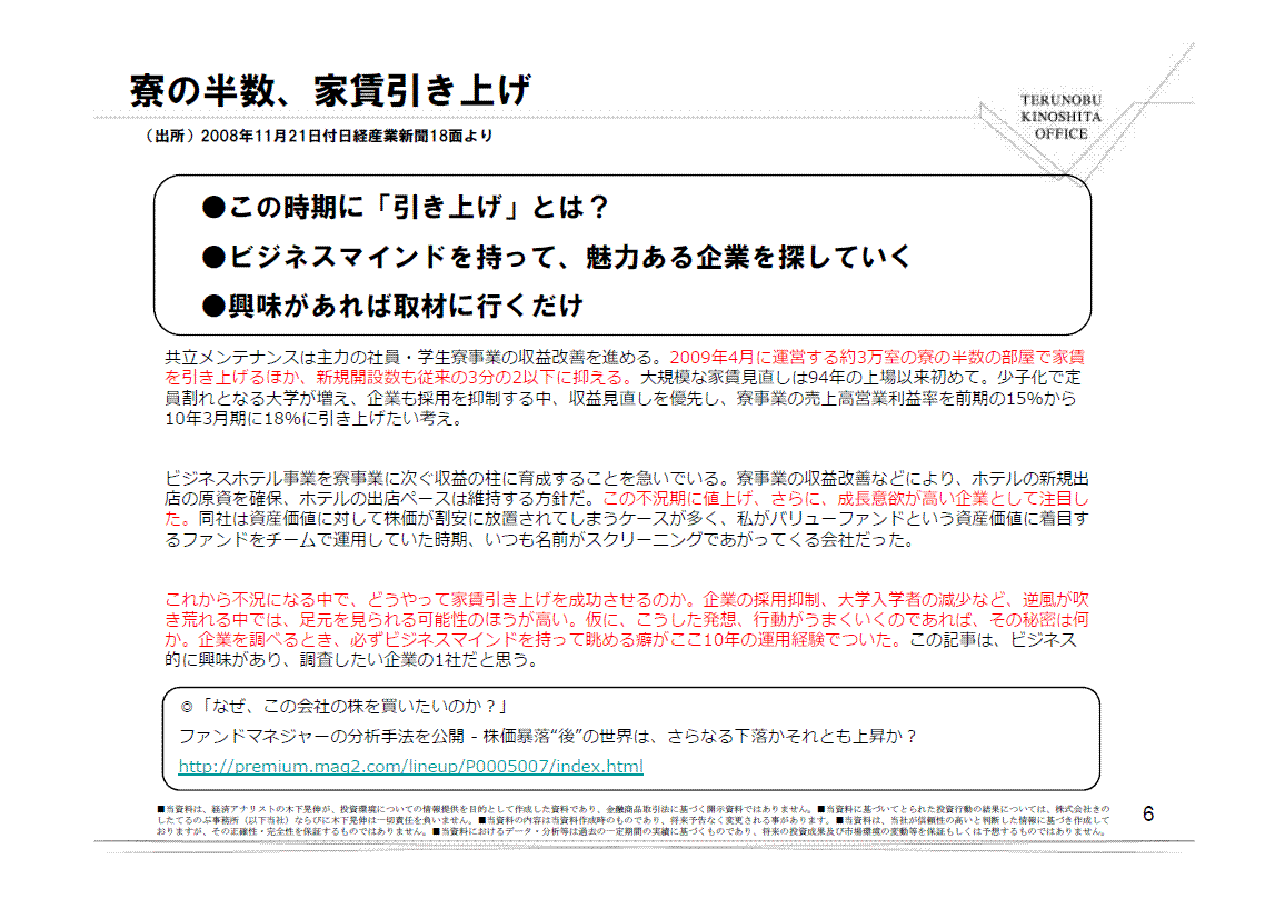 この不況期に値上げ、さらに、成長意欲が高い企業として注目した。