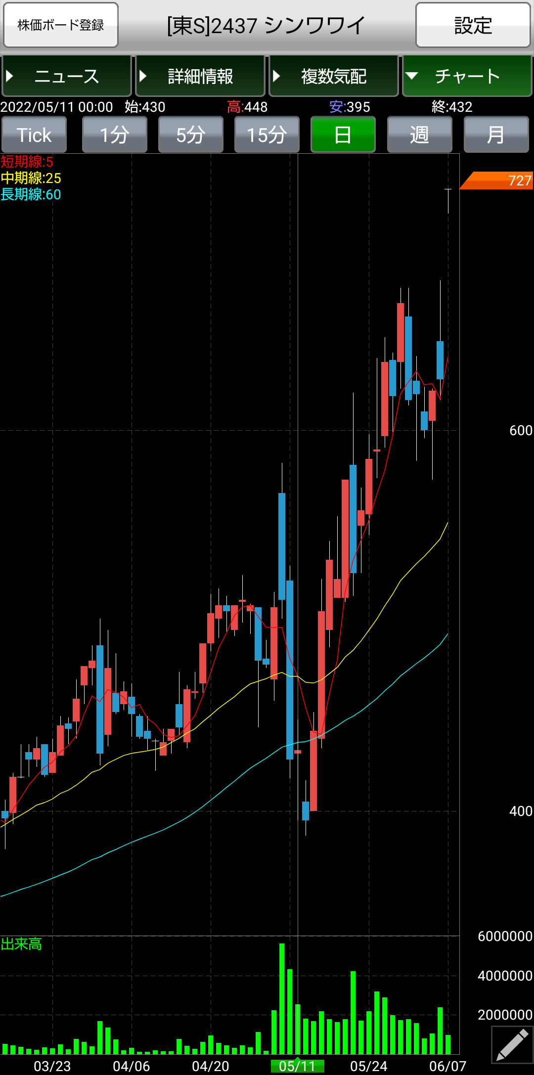 推奨時 430円 ☛ 現在 727円 19営業日で70%上昇してます!