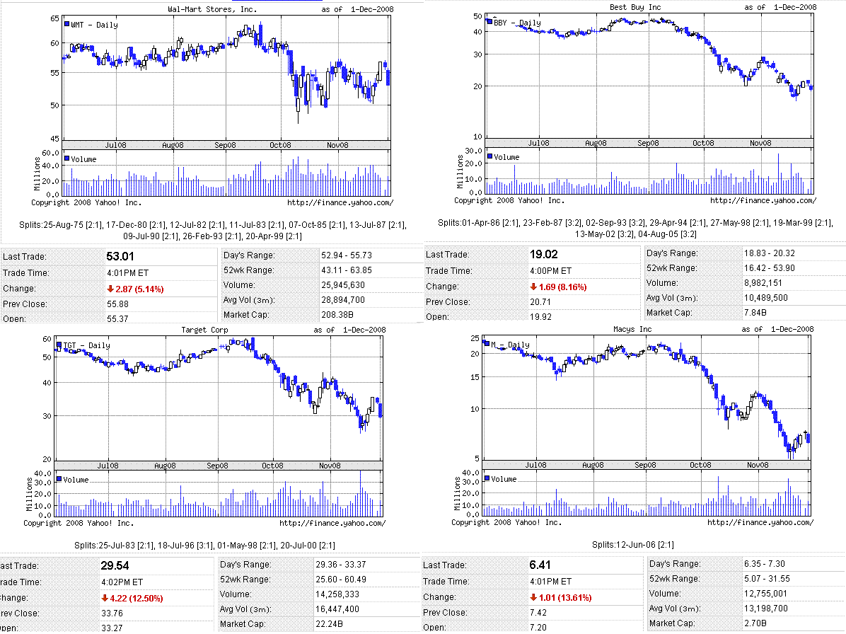 画像2は小売の株価。ディスカウント、家電販売、百貨店と、年末商戦で焦点となりそうなところをピックアップしてます。しかし、ウォルマートの時価総額(Market Cap)は桁違いです。ターゲットは、ディスカウントチェーンでは売上高全米2位なのですが、時価総額は1位のウォルマートの1/10しかないです(まあウォルマートはスーパーマーケットも大規模展開していますが)。ちなみに小売業全体の全米売上高ランキングは、2位はホームデポ(ホームセンター)、3位はクローガー(スーパー)。