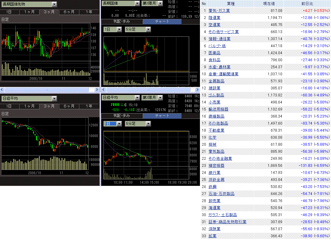 米株安と円高進行を受けて、日経平均は大幅続落。昼頃は日経平均8000円台に戻り、CME終値に比べて下げしぶる感じでしたが、引けにかけてずるずると下げました。東証一部出来高は19億株、売買代金は1.4兆円で、昨日より増えたとはいえ、まだ低い水準です。業種別では、金融、資源関連、電機、自動車などが大きく売られ、ディフェンシブ以外はボロボロでした。トヨタは年初来安値を更新しました。