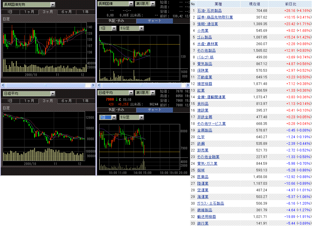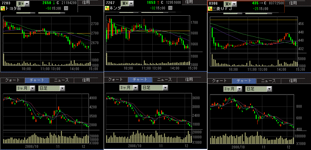 米株安でしたが寄りから買いが入って日経平均は前日比プラスで始まりました。その後もプラス圏で推移する時間が長かったのですが、残り30分で売られて小幅マイナスで引けました。寄りの買いは、5日支給のボーナスによる社員持株会の買い、という話も出ています。韓国市場や香港市場も上昇しているので、アジア株全般に買いが入った可能性もありますね。東証一部出来高は19億株、売買代金は1.4兆円と商いは多くありませんでした。それにしても自動車やメガバンクは弱い動きです。トヨタ、ホンダ、三菱UFJは連日の年初来安値更新です。円高もジリジリと進行しています。