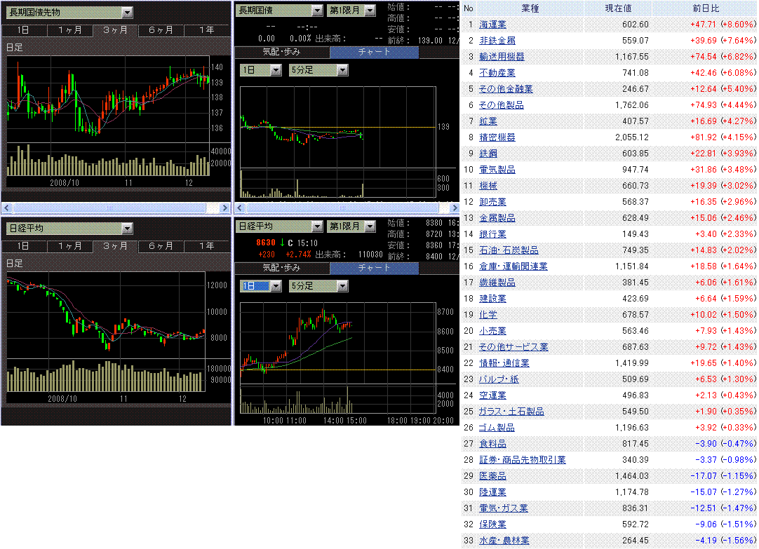 米株安でしたがCME日経平均先物が下がらなかったことから、日経平均は前日終値とほぼ同じ位置からスタート。今日も先物の需給が良く前引けにかけて上昇していき、昼休み中に米自動車メーカー救済で政府と議会が原則合意に達したと報じられ、後場に上げ幅を拡大しました。日経平均先物は、コールオプション売りへのヘッジ買いもあった感じです。8500円、8750円、9000円のコール建玉が結構ありますから。