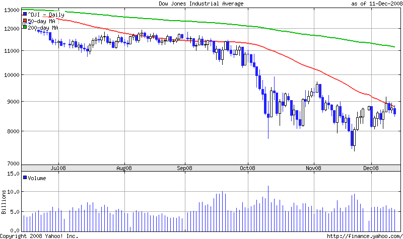 添付チャートで見てもおわかりの通り、ダウはずっと下降線で、今年の5月以降50日線を上回っておりませぬ。もっと前まで遡ると、昨年の10月以降で50日線を上回ったのは、今年の3月から5月までの期間のみ。今回もいいところまで行ってはいるものの、ここへきてのビッグ3救済問題がこじれており、またもや不安定な週末を迎えそうでござる。