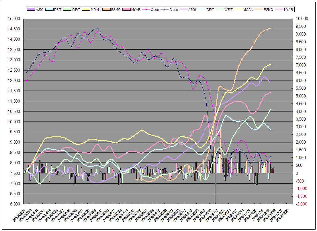 12月はなんと言ってもビッグ3をテーマに第1週はビッグ3の経営不安により大きく下げ、第2週はビッグ3救済案合意への期待から上昇していましたが、最終日である12/12に突如廃案の報道で一転して売り圧力が高まり大きく下げました。