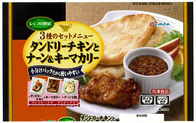 「シェフの厨房」シリーズの新アイテムでカレー味のタンドリーチキンとナン(2枚)に、ほどよい辛さのキーマカレーの3種類をセットにしたものです。