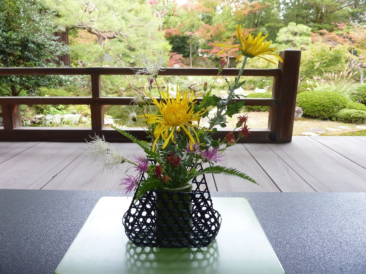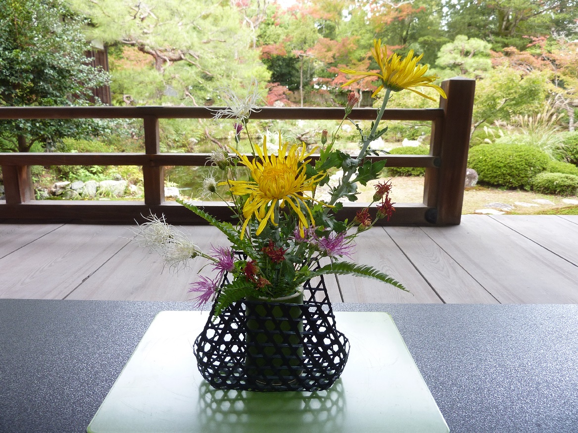 大覚寺の竹林での竹器で嵯峨菊をいける。