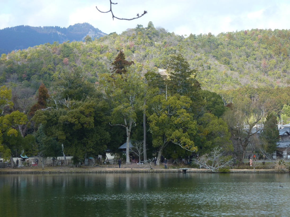 重厚な時代物の着物が大沢池の風景に見事に溶け込んで、