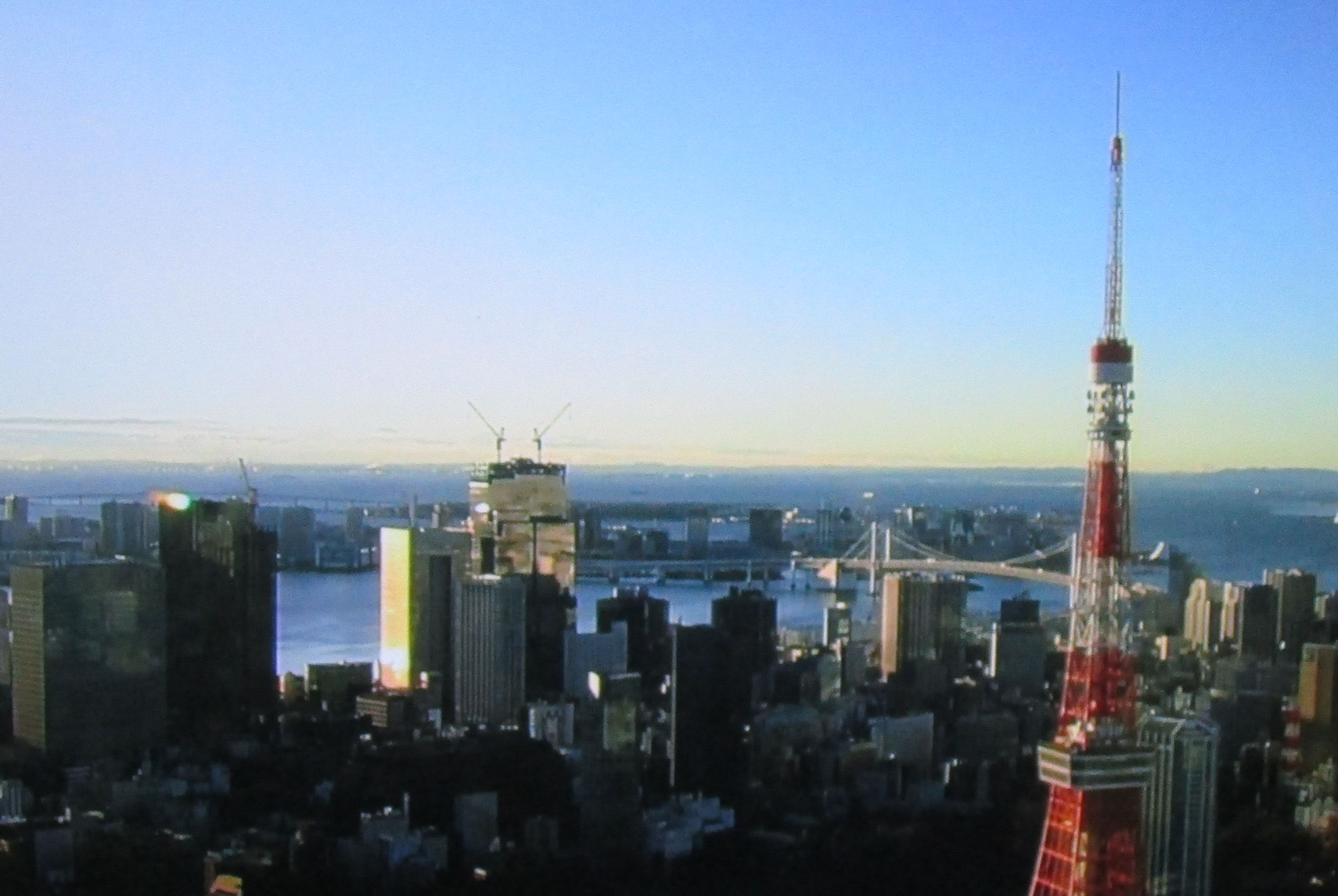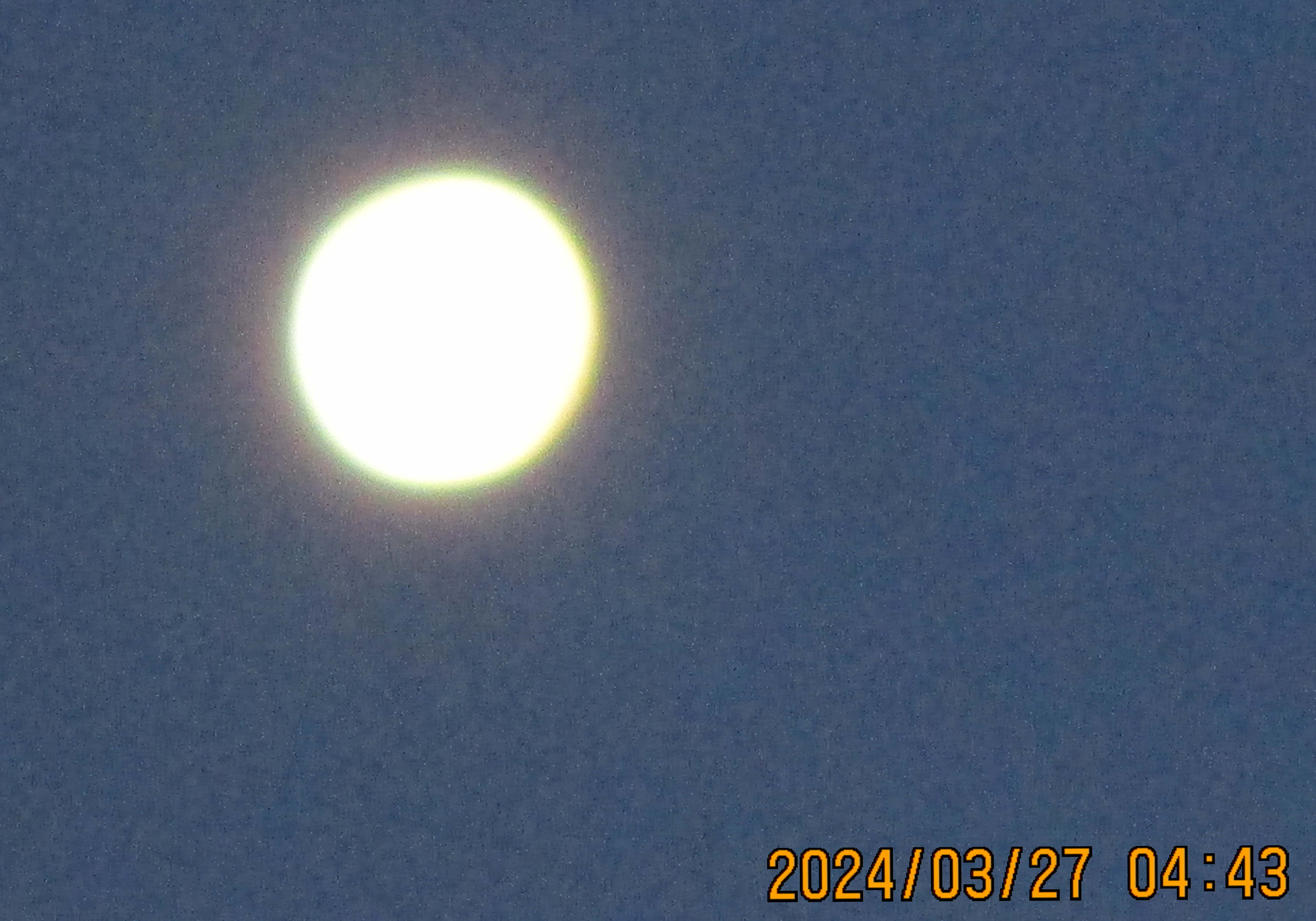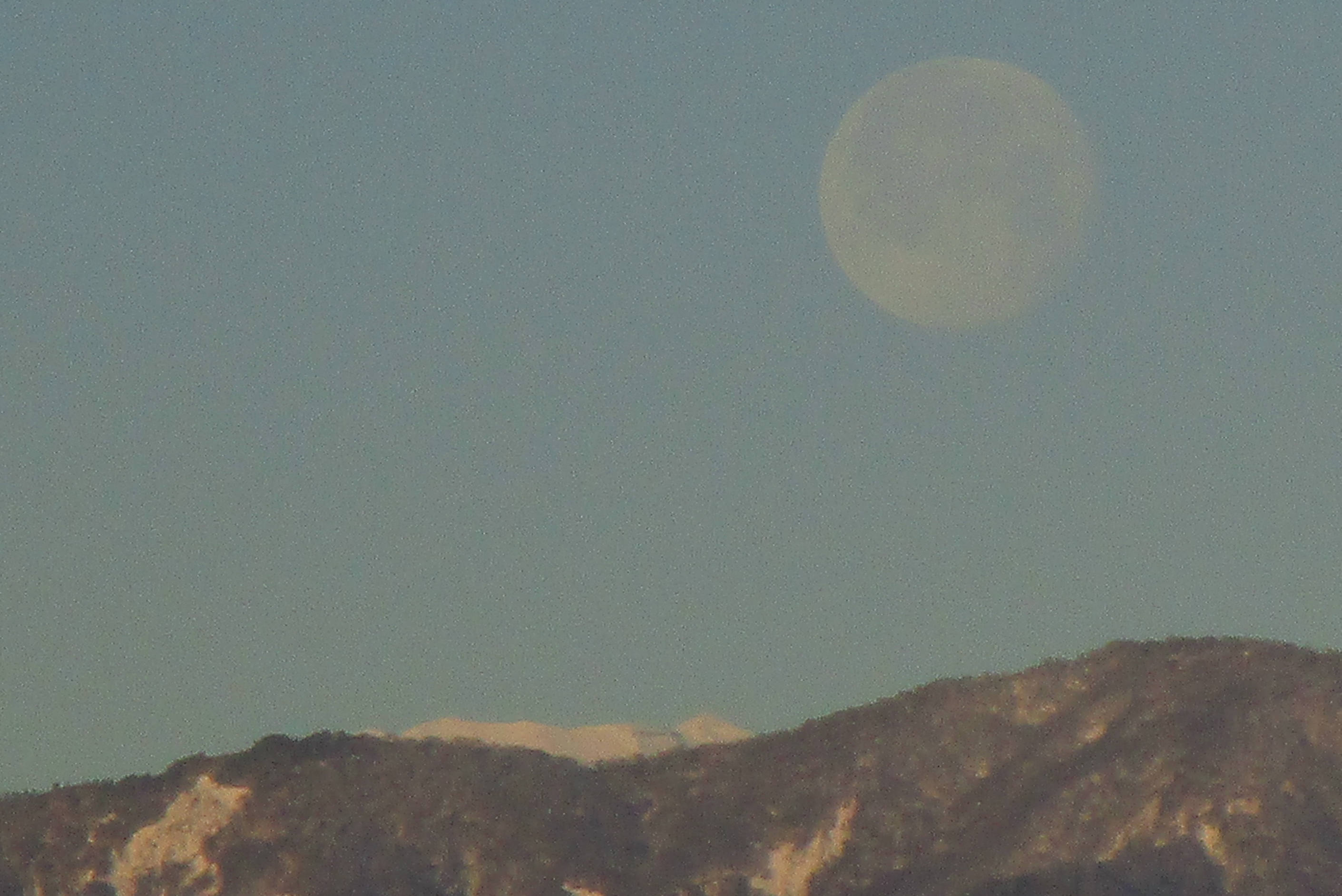 夜明け前の満月と、夜明けごろぎりぎり見える月が、うちからは西方の山の上にちょっとだけ見える富士山頂のあたりに沈むところ。