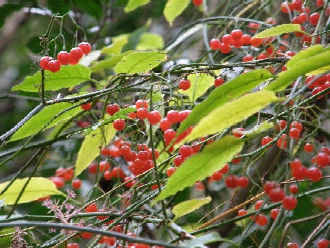 写真は途中で見かけた赤い実。左側がヤマホロシ(なす科、ナス属)、右側がフユイチゴ(ばら科、キイチゴ属)。その他にも、ハナミョウガ、ヤブコウジ、センリョウと赤い実がなっていました。アオキの実はまだ青く、赤くなっていませんでした。