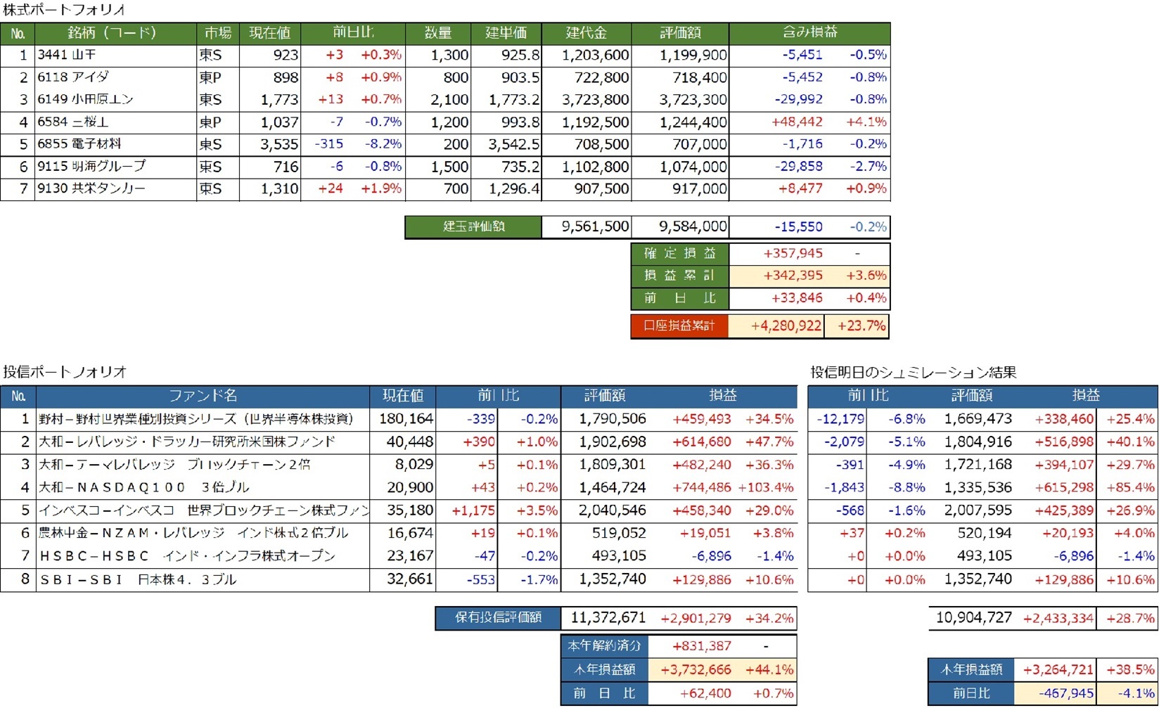 ちなみに大きく下げたところで少し玉を追撃していて、昨日時点でNKに300k、昨夜は野村世界半導体とドラッカー研究所に200kづつ約定。
