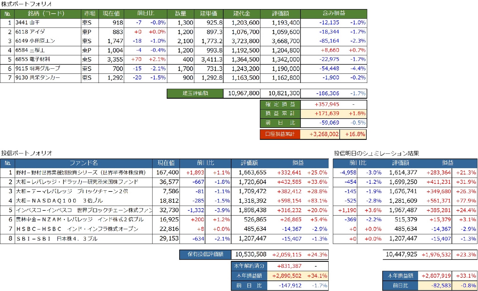 その結果、NDXが-0.93%、ビッグ5平均が-0.71%、SOX指数が-3.11%、NVDAが-2.61%、一方でトランプ氏がBTCイベント参加と伝わったことでBC関連平均が+7.14%となり、NKとインド関連を除く明日の投信は-82kと予想