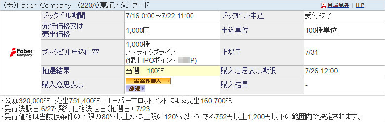 SBI証券から100株当選。 今までIPOはかすりもしなかった法人口座。 今年はIPOの当選不作なので蓄積されたポイントを気まぐれ投入しました。 ポイントの当選ラインは200ポイントあたりだったようなので、ポイントを投入しすぎました。 はずかしいのでモザイクです。