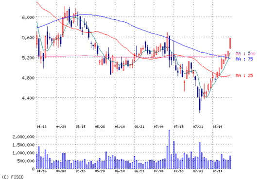 綺麗な右肩上がり。昨日下げたけど、今日上昇中。出来高もついてきてるので。