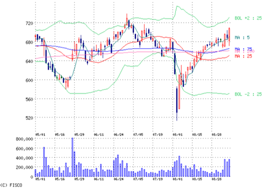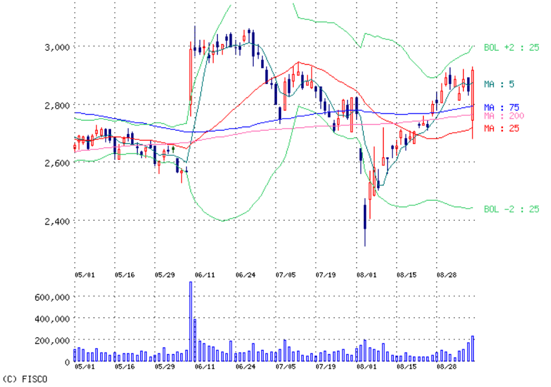 5日線以外は右下向きなんだよな。25がかろうじて横向きと見れなくもないが。他のチャートを見てやっぱり4本線とも右上がりが大切なことを、強く悟った。