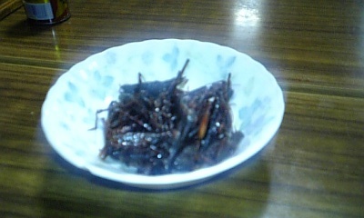 ちなみに上にいる茶色いもの「イナゴの甘煮」