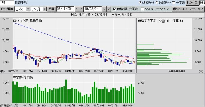・ダウの上昇を好感しての上昇であったが、戻り待ちの売りに頭を押さえられた格好でした。確かに価格帯別売買高をみても、1つの山が今日の高値付近で盛り上がっている。逆にここを抜ければ薄くなるので上放れする可能性もありかな?ただ週末に日米ともに消費者指数、アメリカはさらに雇用の統計の発表があるので、まだまだ注意が必要なのでしょう。