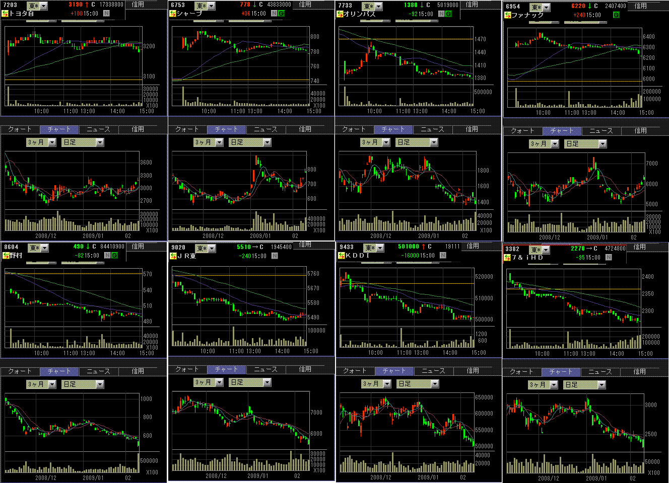 個別銘柄のチャートは、トヨタ、シャープ、オリンパスが先週金曜引け後に下方修正を発表。ファナックは、機械受注後の反応。野村は増資観測。あとは、最近やたらと弱い内需ディフェンシブ系。