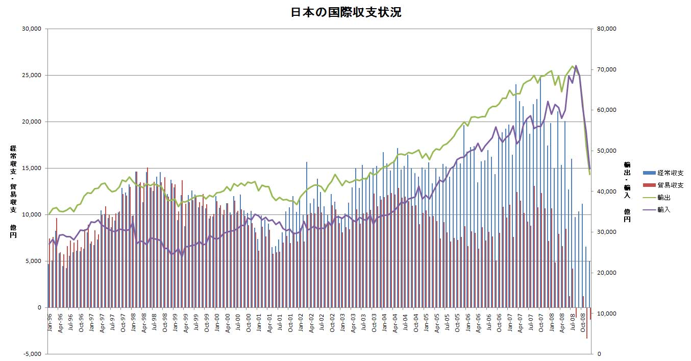 「2008年の経常黒字額は、前年比34.3%減」といった伝え方の記事が多いですが、後半の落ち込み方の方が大事です。