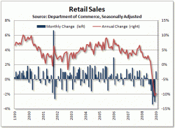 米商務省が12日発表した1月の小売売上高(季節調整済み)は3446億ドル(約31兆円)となり、前月に比べ1.0%増えた。市場予想(平均値は0.8%減)に反し、7カ月ぶりのプラスとなった。前年同月比では9.7%減。 前月比では、リーマンショックで金融危機が広がった昨年9月以降で初めての増加となる。自動車関連を除いた売上高は0.9%増。建築資材などが前月から3.2%減ったが、ガソリンと電気製品の売り上げがともに2.6%増えた。 商務省はまた2008年11月、12月分を下方修正した。11月を2.4%減(前回発表は2.1%減)、12月を3.0%減(同2.7%減)とした。