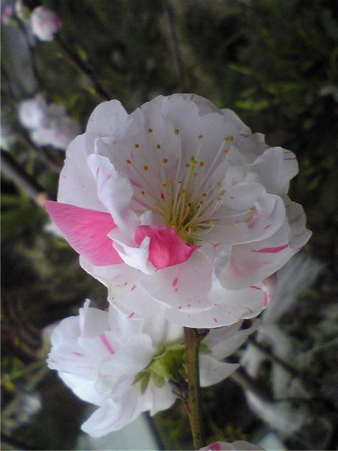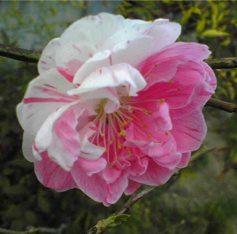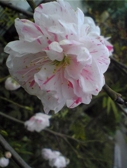 新瑞橋から石川橋までの山崎川の桜を見ようと行きましたが、大雨で咲いた花は散ってしまい。残っていたのは彼岸桜ぐらいでした。だいぶ損した気分でしたが、多くの人が立ち止まって、見上げていました。来週が見ごろでしょう。いく途中に桃のきれいな花が咲いていました。「絞り」という品種のようです。「源平」というのもあるようです。もっとも桃は食べれないそうで。大きい花ですが、最近人気があるようです。