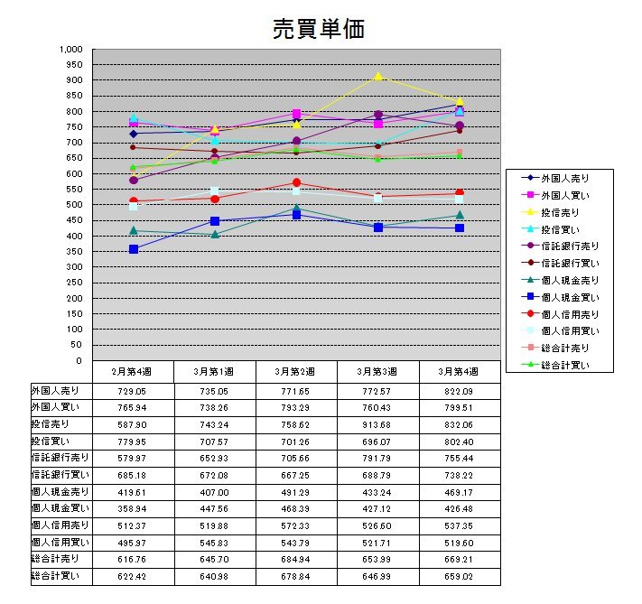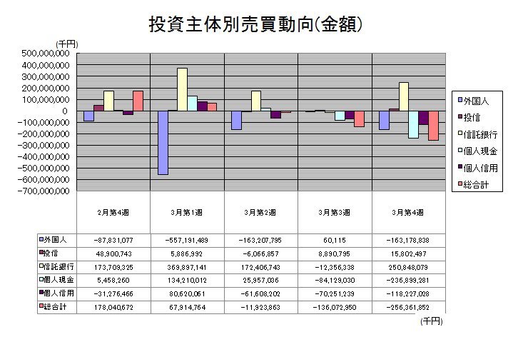 3月第4週の主要3市場の投資主体別売買動向が公表