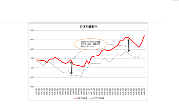 日米は短期的にはとてもよく連動します。そして、両者のかい離が大きくなると調整が生じます。今日これから開くニューヨークの状況にもよるのですが、乖離が再び大きくなっています。日経平均が大きく上げただけに、NYダウがどの程度上昇できるか気になるところです。