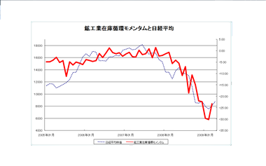 この鉱工業在庫循環モメンタムと日経平均株価の動きを示したものが最初にお目にかけた図なのです。