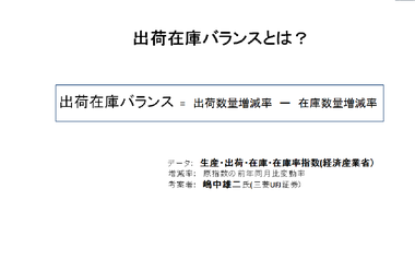 第一段階は「出荷・在庫バランス」です。経済産業省のデータ(「生産・出荷・在庫指数速報」)を使って、比較的に簡単につくることができます。数量ベースの指標であることが大きな特徴です。
