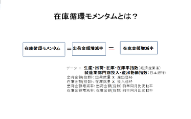 第二段階は「在庫循環モメンタム」です。経済産業省のデータに、日銀のデータ(「製造業部門別投入・産出価格指数」)を組み合わせて作ります。出荷や在庫を数量ベースではなく、金額ベースにしているところがミソです。