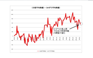 ただし、日経平均株価はダウ平均株価に比べて速いスピードで上昇を続けてきていましたので、今日の米国市場の上昇でも、両国市場の乖離が大幅に進んだとは言い難い気もします。
