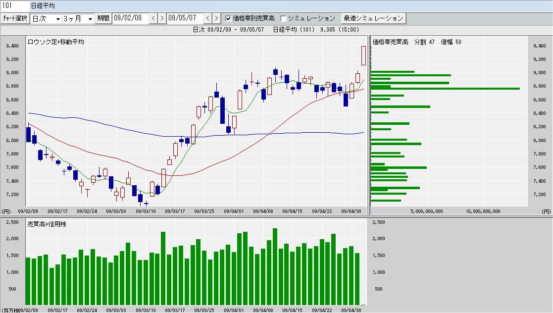日経平均株価 9,385.70 +408.33 +4.55%