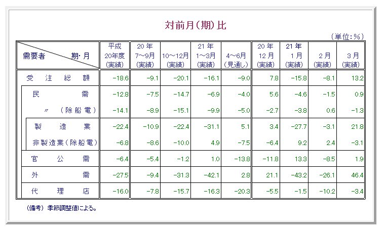 民間設備投資の先行指標である「船舶・電力を除く民需」の動向を見ると、21年2月前月比0.6%増の後、3月は同1.3%減の7,279億円となった。このうち、製造業は同21.8%増の2,567億円、非製造業(除く船舶・電力)は同3.1%減の4,965億円となった。