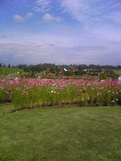 子供たちが遊具で思い切り遊んでいる間に新鮮な空気を胸いっぱい吸って、緑の山並みと青空、そしてピンク色のコスモスの花を眺めて心身ともにリフレッシュしました。