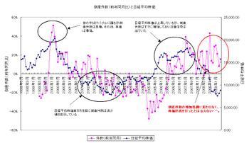 赤丸を見てください。株価は3月に大底をつけているものの、倒産件数は前年同月比で増加基調が続いています。株価は2003年のような上昇トレンドを描いていますが、倒産件数は当時とは様相が大きく異なります。倒産件数から見て、まだ株価は大底を打っていないと判断して良いでしょう。