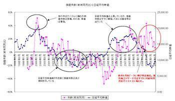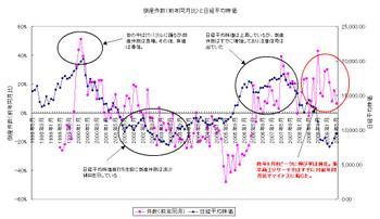 前回の記事の復習ですが、「倒産件数が対前年同月比で減少に転じれば、株価は底打ちと判断して良い」との結論を最終的に導きました。(なお、今回のサブプライム不況を除き、過去10年間で見ると、倒産件数の動向の方が株価に先行しています。)
