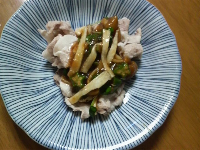 件のたれは、市販の冷しゃぶたれ、ポン酢、レモンの絞り汁がベース。これにオクラ(茹で、もしくはレンジで温めて輪切り)、なめこ、山芋の千切り、大根おろし、貝割れ大根を入れて出来上がり。