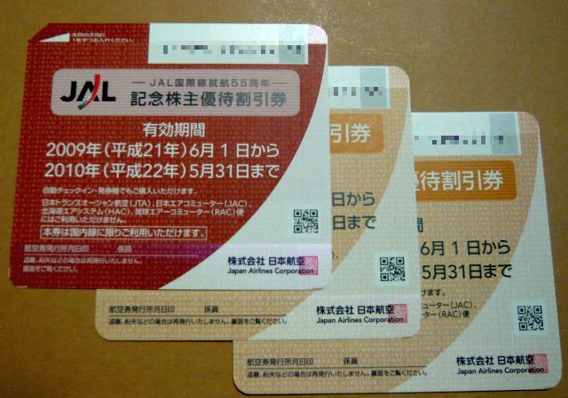 のJAL、JEXが運航する国内線全路線対象で1枚につき片道運賃が50%引きになる優待券がもらえます。