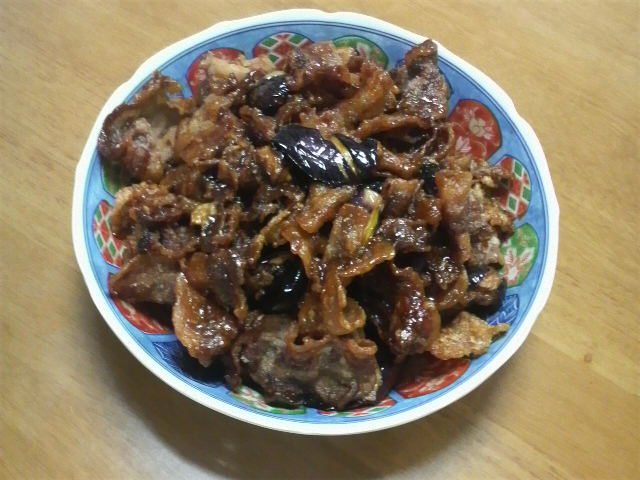 作り方は、ナスをピーラーで筋状に皮を剥き、大きめに乱切りして油で揚げる。豚バラ肉に片栗粉をまぶして同じく揚げる。これらを、しょうゆ、レモンの絞り汁(肉200~250gに対してレモン1個まるごと絞る)、砂糖、めんつゆ(少々)の特性たれ(それほどの代物でもない…)で和えまする。