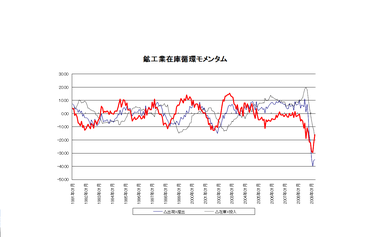 それでは、出荷金額の増減率から在庫金額の増減率を差し引いた「在庫循環モメンタム」です。「出荷在庫バランス」以上に底打ちが明らかです。理由は原材料価格(投入価格)が出荷価格(産出価格)より急速に低下していることです。
