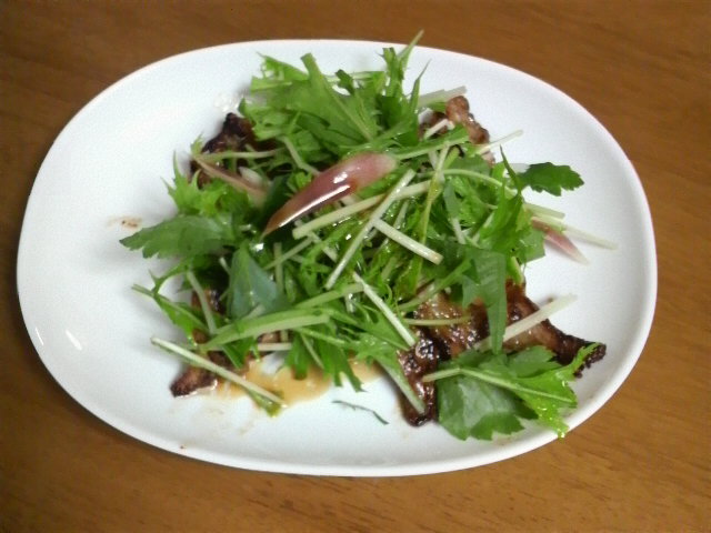 拙者の料理はいつも盛り付けが雑なので、今回もお恥ずかしゅうござりまするが、やはり香味野菜でも水菜、三つ葉、みょうが決め手かと存じまする。案外あっさり頂けるかと(^^)