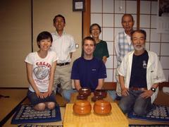 前列ひだりから、南さん、ブライアン君、翔年、後列T氏、tさん、M氏 右の写真は塾の庭にて記念写真