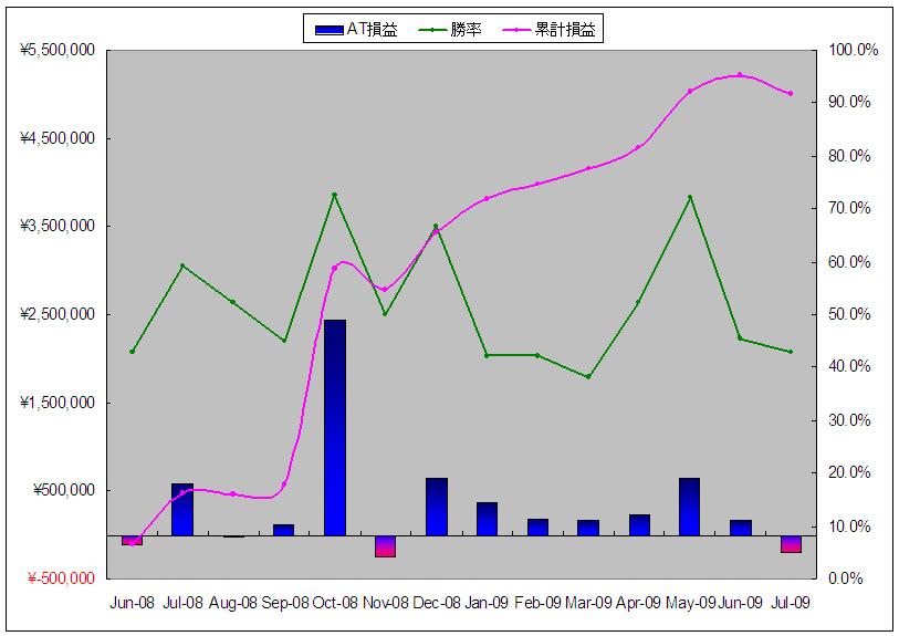 2008年6月~2009年7月(7月30日現在)での累計損益は501万円、勝率は51.7%、運用資金は1枚分(現在であれば50万程度)です。
