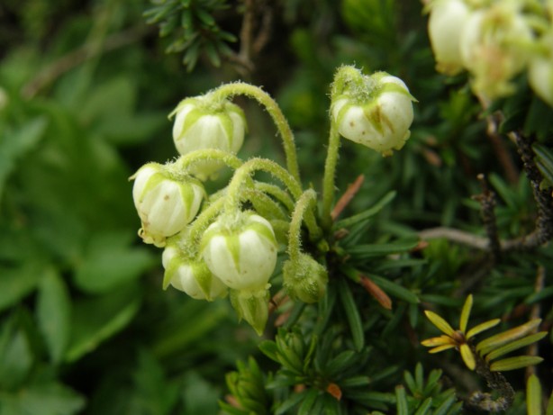 写真を撮った時は「ツガザクラ」と「アオノツガザクラ」同じものだと思っていました。後で良く見ると、違うんですね。ツガザクラは「ガク」と「カタク」が赤くて、アオノツガザクラのそれはうす黄緑ですね。