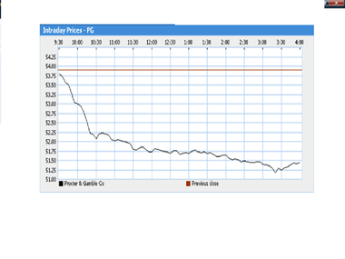 前日引け後に控えめな業績予想を出したシスコの株価はザラバで戻したのですが、期待を下回る決算内容だったP&Gの株価が4.5%下落しました。