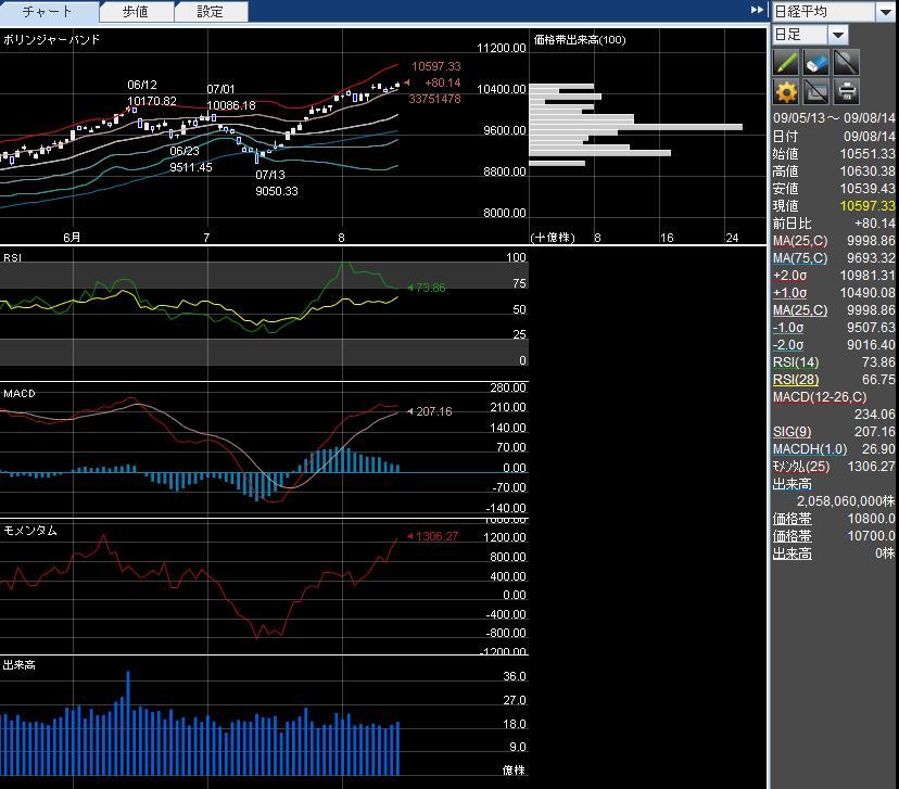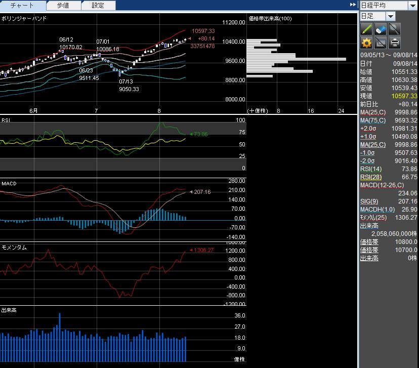 RSI14: 74近辺 (90近辺)