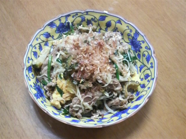 前回はゴーヤ、豆腐、卵、素麺を別々に揚げたり、炒めたり、茹でたりと、皆さまには大変不評だったものの、今回は至ってシンプル。卵と素麺はさすがに別に炒め、茹では行いまするが、その他の材料は、ゴーヤのマヨ炒めに始まって、肉、豆腐、もやし、卵、にら、素麺の順に炒めていき、塩、こしょう、鶏がらスープの素を加え、最後にしょうゆで味を整え、かつおぶしを振りかけて出来上がり。