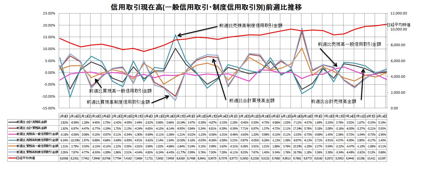 この週(10―14日)の日経平均株価は185円上昇し、週末には1万597円の年初来高値を付けた。相場上昇で個人投資家の投資余力が高まり買い残が増加した。「(環境関連など)一部の材料株へ買いが集中した」(東海東京証券の鈴木誠一マーケットアナリスト)との指摘があった。