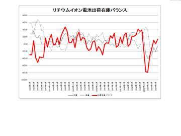 経済産業省の鉱工業生産動向を用いて、製品ごとに出荷在庫バランスを見ると、突出して好調なものがあります。それがリチウムイオン電池。